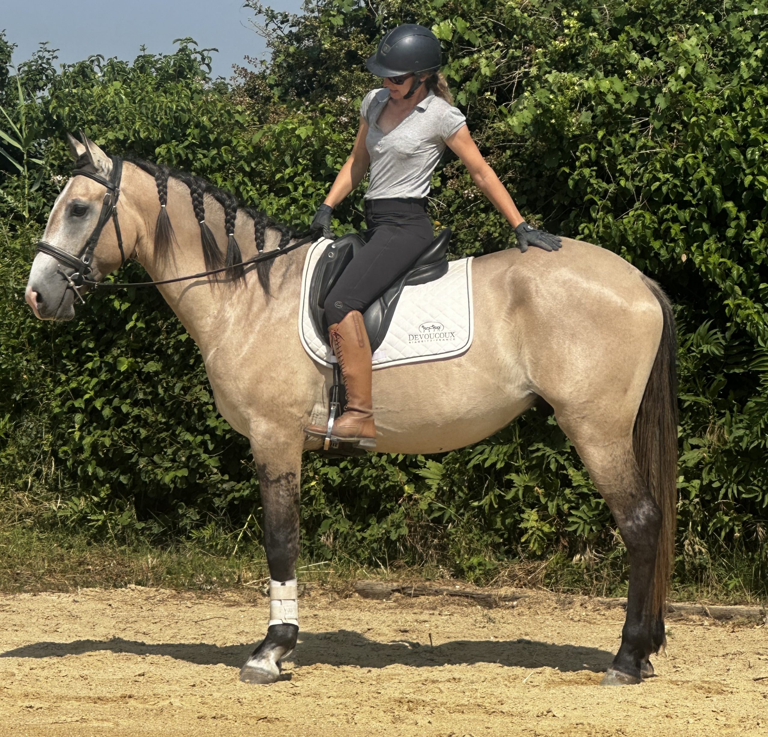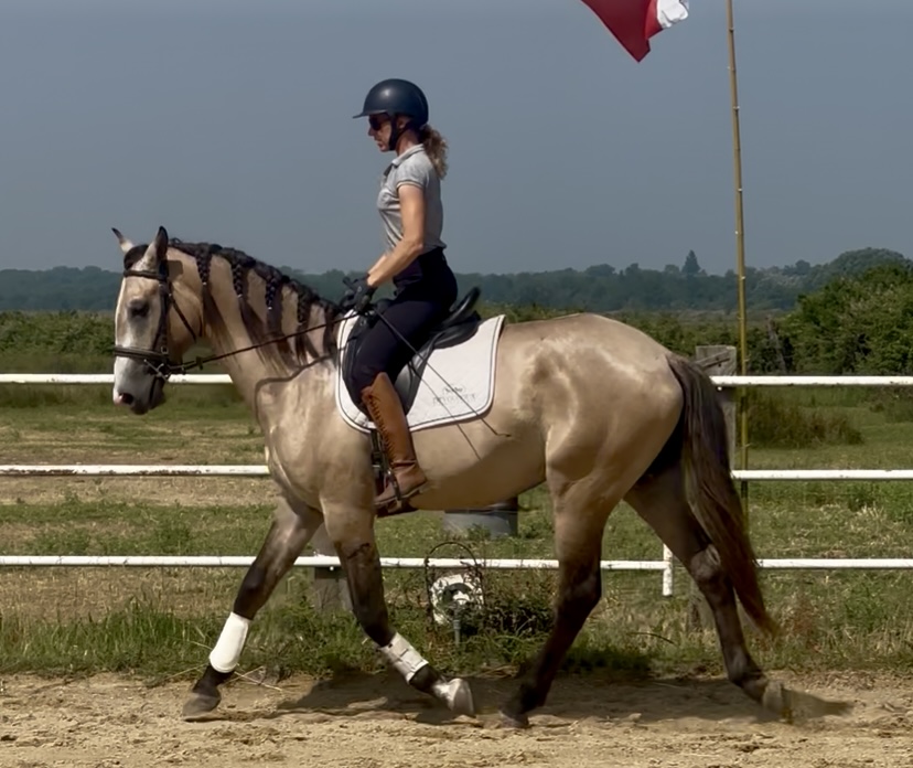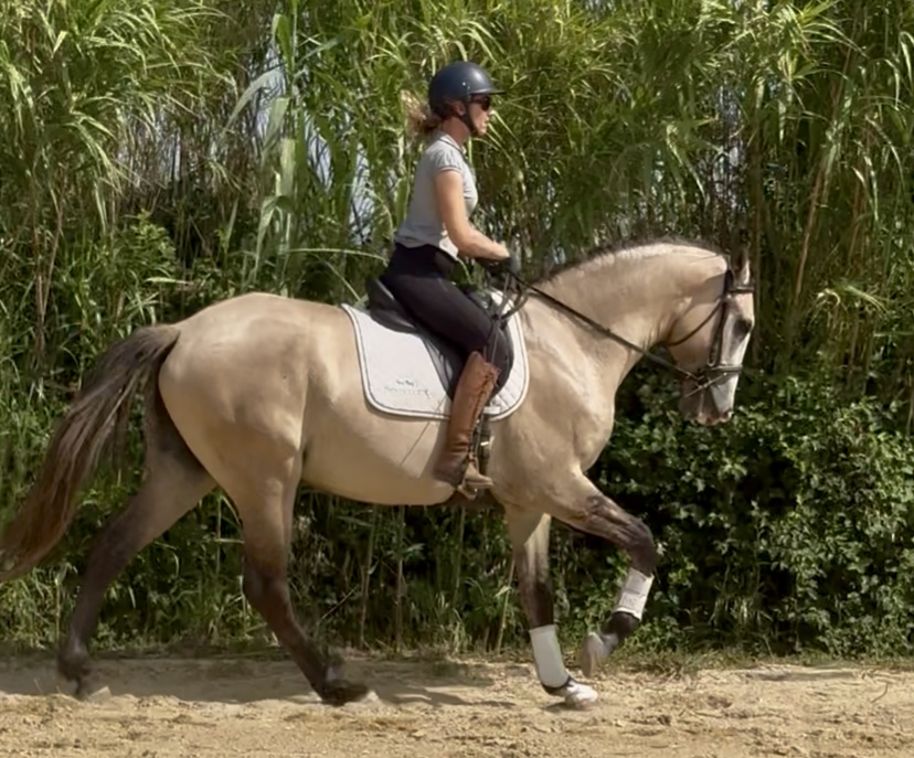 Characteristics: A young 3-year-old stallion, with ample size and gaits ideal for classical dressage. Broken in in the spring, Soberano is continuing his basic training. He is a calm and willing horse, always in one piece. He is not overly hot-tempered and lives in the paddock with his friends. He is trained at all three gaits and rides alone or with a companion outdoors. He possesses a balance and natural cadence that are a real asset for dressage. He should be 1.70m tall at the end of his growth.
