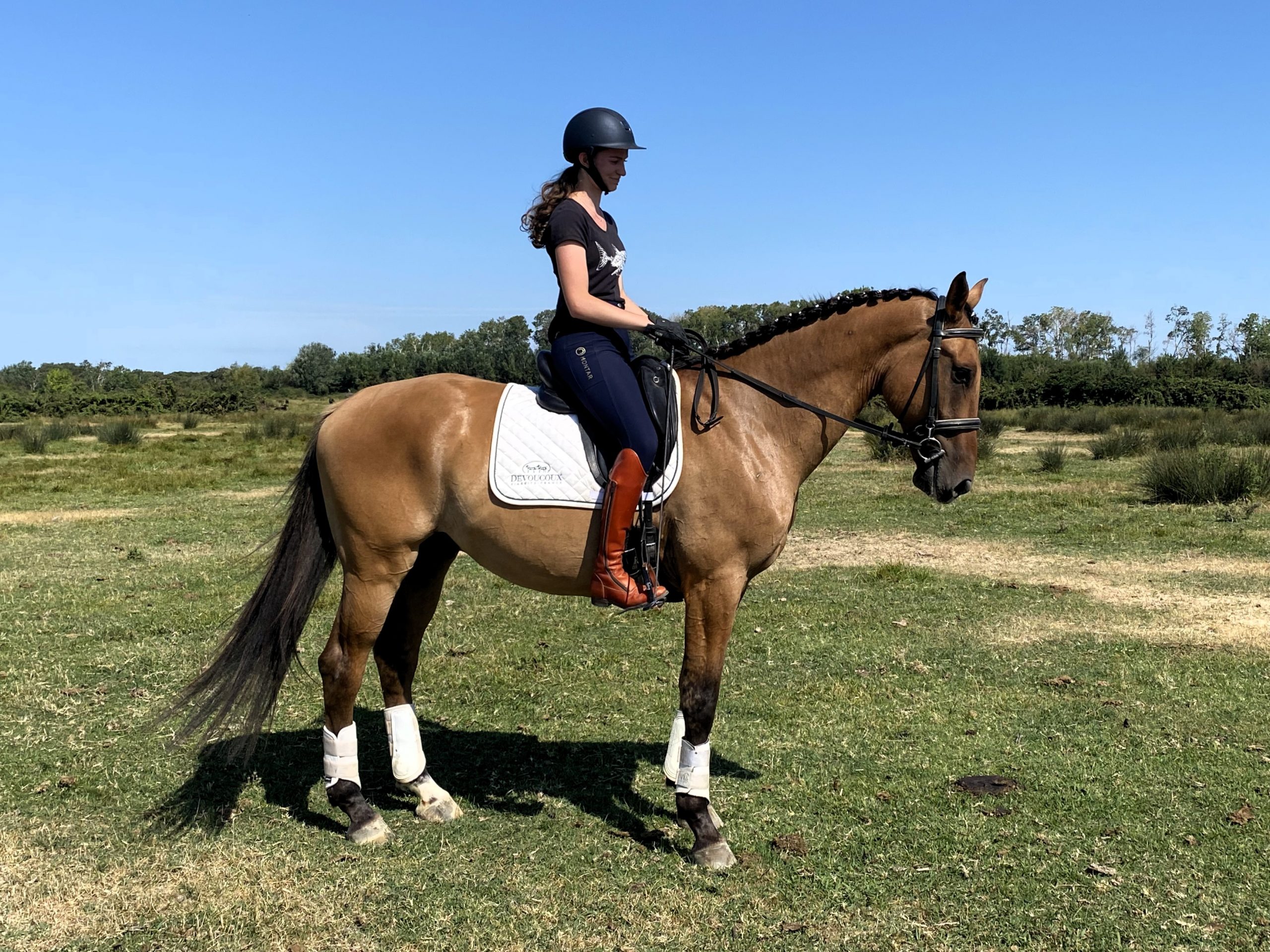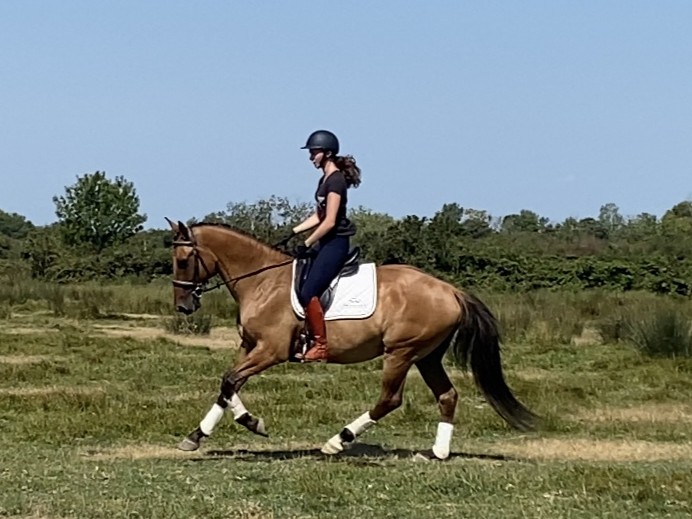 Jeune cheval mis aux trois allures, dynamique et appliqué, toujours volontaire, il apprend vite!