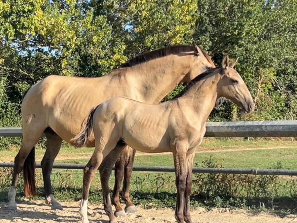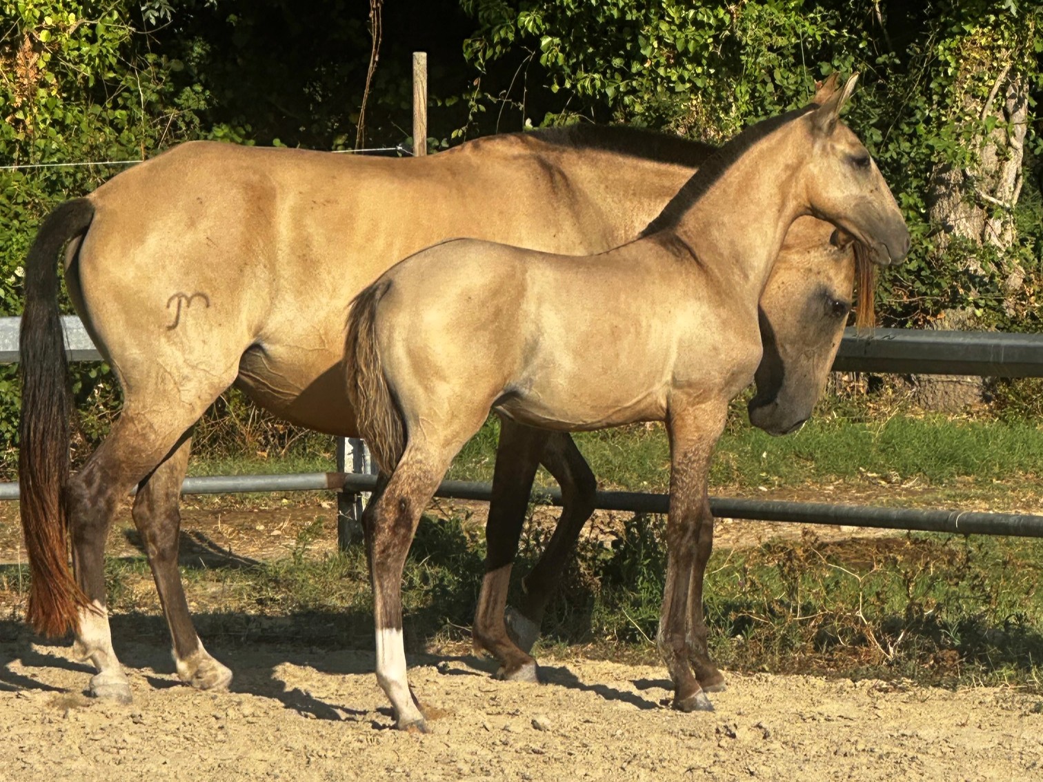 Poulain isabelle dun (hétérozygote sur l’agouti), idéal pour un projet de reproduction et de dressage classique au vu de sa génétique et de sa locomotion. Valor promet un modèle sport et fonctionnel avec une taille future d’environ 1M70.